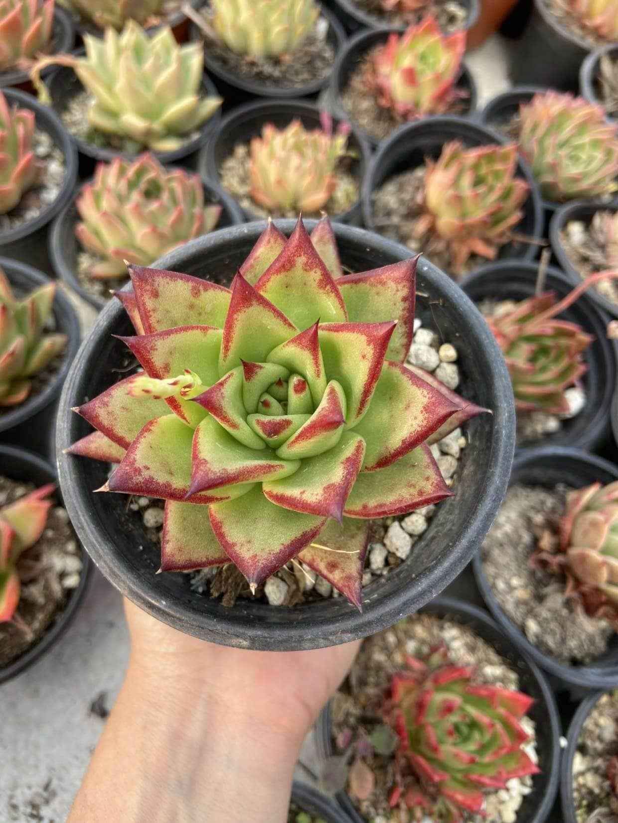 Roseta compacta de tonos claros y crecimiento lento.